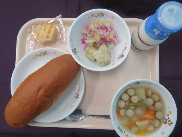 今日の給食は、「大阪・関西万博 開催記念献立 ~ドイツ料理~」クロロールパン ケーニヒス・ベルガークロプセ(肉団子のホワイトソースがけ) ザワークラウト アイントップフ バウムクーヘン 牛乳 です。