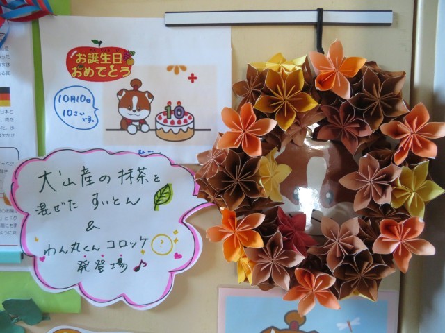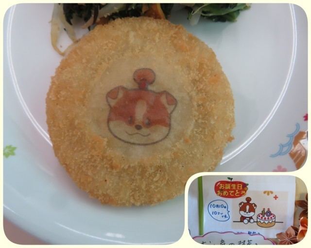 今日のわん丸君コロッケは、給食初登場です♪食器のデザインにもわん丸君がいますね♪ちなみに、わん丸君は、10月10日が誕生日。永遠の10才です。お祝いで、コロッケのバッチのようなイラストでみんなにおいしい給食を食べてもらおうと登場しました!