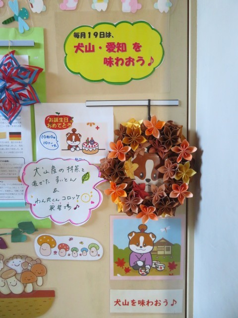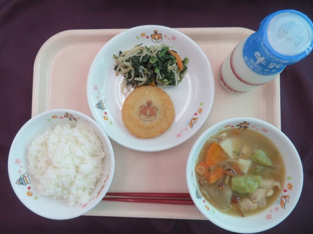 今日の給食は、「犬山・愛知を味わおう♪」です。ごはん わん丸君コロッケ 青菜のひじきごま和え 犬山抹茶すいとん汁 牛乳 です。