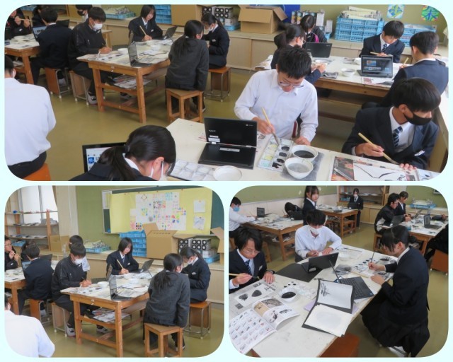 基本技法を習得した後、本格的に水墨画に取り組んでいます。制作にあたっては、表現したいデザインをChromebookで調べ、イメージを固めてから筆をとります。完成した作品は掛け軸に仕立てる予定です。どのような仕上がりになるか、今から楽しみですね。