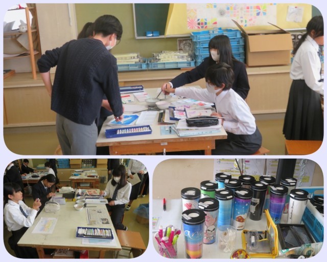 1年生の美術の授業では、オリジナルの「マイタンブラー」制作に取り組んでいます。指定された透明な用紙に、思い思いの個性あふれるデザインを丁寧に描き込みました。そして、このデザインシートをタンブラー本体にセットすれば完成です。出来上がったのは、まさに世界に一つだけのオリジナルデザインのタンブラーとなりますね。完成が楽しみです。