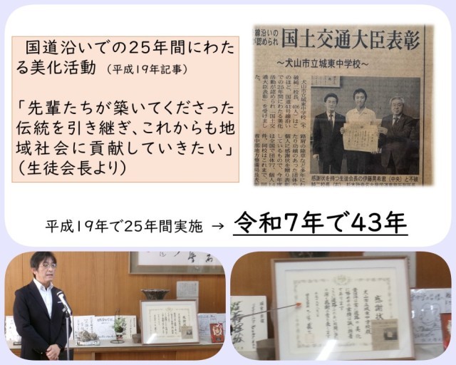 校長先生の話では、平成19年度に国土交通大臣から表彰された感謝状についての話でした。当時、この受賞は新聞記事でも紹介され、「国道沿いでの25年にわたる美化活動」に対しての表彰であったことが記されています。記事には、当時の生徒会長の「先輩たちが築いてくださった伝統を引き継ぎ、これからも地域社会に貢献していきたい」というコメントも掲載されていました。