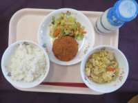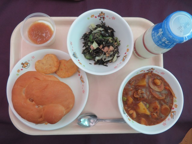 今日の給食は、りんごパン 大豆入りナゲット ポークシチュー ひじきのマリネ 犬山桃ジャムソースミルクプリン 牛乳です。