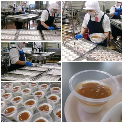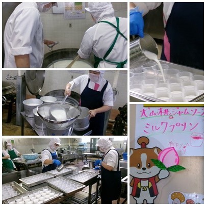 デザートは、給食室の手作りです。犬山産の桃ジャムは、JA愛知北に協力を依頼して、城中の給食分を届けてもらいました。犬山産の桃のみで作られた桃ジャムを、手作りしたミルクプリンの上にかけて桃が味わえるようにしました。桃は犬山の特産のひとつですが、年々生産者も高齢化で少なくなっています。カップにひとつひとつ入れて紹介できるのも、給食室が学校にある犬山ならではの手作り献立です。犬山の桃の香りや甘みを感じながら、味わってくださいね。