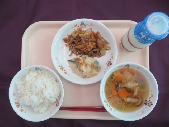 今日の給食は、ご飯 さわらの守口大根マヨ焼き 五目きんぴら 合わせだしのうま味汁 牛乳 です。
