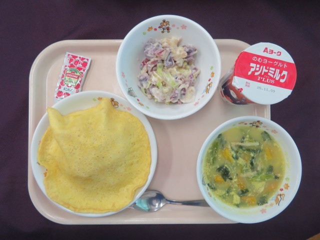 今日の給食は、セルフオムライス チキンライス(自校炊飯) うす焼きたまご ケチャップ 紫いもの魔女サラダ かぼちゃ入り豆乳スープ 牛乳 です。