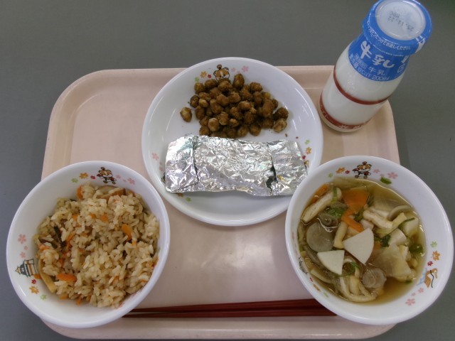 今日の給食は、人参のかきまわし(自校炊飯) さんまの銀紙焼き けんちん汁 犬山ほうじ茶きなこ豆 牛乳 です。