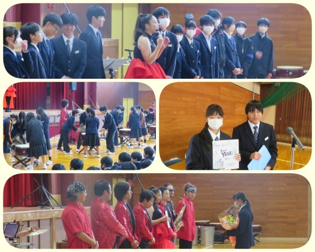 鑑賞会の途中では、生徒参加型のコーナーがありました。希望者がリズムに合わせて和太鼓の演奏したり、会場全体で手拍子に合わせてリズムを刻んだりと、生徒と演者が一体となって音楽を創り上げる瞬間が生まれました。この交流を通じて、生徒たちは会場に満ちる連帯感を深く味わうことができました。また、奏者の方々の息遣いや指使い、体で表現する姿を間近で拝見できたことは、生徒にとって大変貴重な体験となりました。最後に、生徒会長がお礼の言葉の中で、「演奏を通して、世界の様々な音楽を楽しむことができました」と感想を述べてくれたように、生徒たちはまさに目と耳、そして体全体で音楽の魅力を堪能しました。