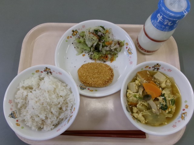 今日の給食は、麦ごはん 小松菜としめじの卵とじ 根菜コロッケ 愛知の赤じそ和え 牛乳 です。