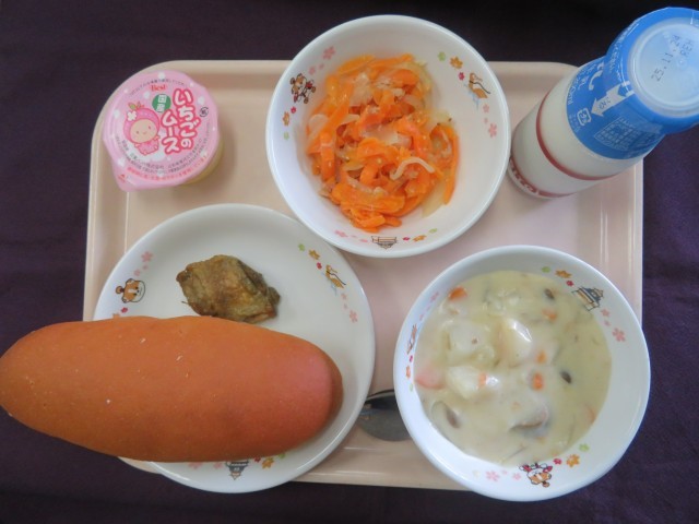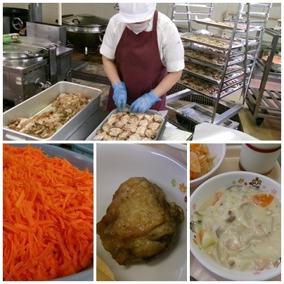 今日の給食は、「大阪・関西万博献立~フランス料理~」ミルクロールパン 鶏肉のコンフィー(オイル焼) 鮭ときのこのフリカッセ(クリーム煮) キャロット・ラペ(人参サラダ) いちごのムース 牛乳 です。先月、4月から開催された万博も無事に閉幕しました。万博にパビリオンを出して参加していたフランスの料理をとりいれました。