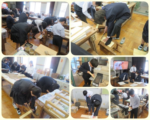 1年生の技術の授業で、木工に取り組んでいます。生徒たちは棚の制作を進めており、現在は材料となる木材の加工段階です。けがきをした線に沿って、のこぎり引きで木材を正確に切断していきました。決められた寸法通りに仕上げるため、生徒たちは集中して作業に取り組んでいます。早く切断を終えた生徒は、切り口をやすりなどで滑らかに整える作業に取り組みました。