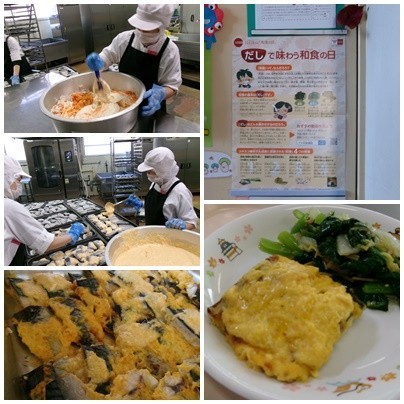 今日の給食は、「だしで味わう和食の日」白飯 秋さばの紅葉焼き 小松菜のなめ茸あえ 合わせ出汁のかき玉汁 牛乳 です。11月24日は、語呂合わせで「いい日本食」「和食の日」です。和食が、ユネスコ無形文化遺産に登録されたのを記念に制定されました。和食は、煮干しやかつお節、昆布、干し椎茸などいろいろな「だし」が大切な役割を果たしています。給食でも、いつもじっくりと出汁(だし)をとって作っています。1年生の皆さんは、先日、賛否両論名古屋の料理長さんに「だしの授業」でも学びましたね!!2,3年生の皆さんも1年生の時に教わり、かきたま汁を味わいましたね。