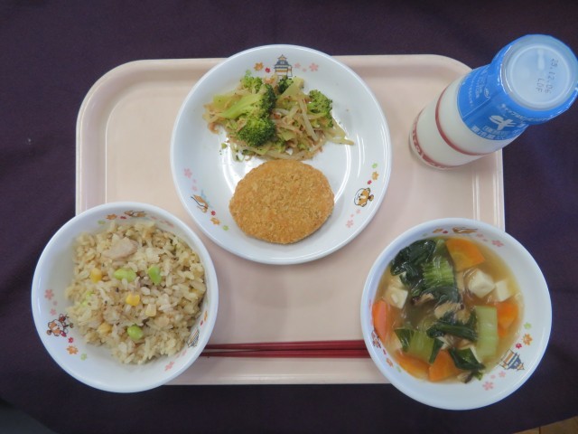 今日の給食は、豆じゃこカラフルごはん(自校炊飯) さつまいもコロッケ 豆腐と春雨のスープ ブロッコリーと干しえびの中華和え 牛乳 です。