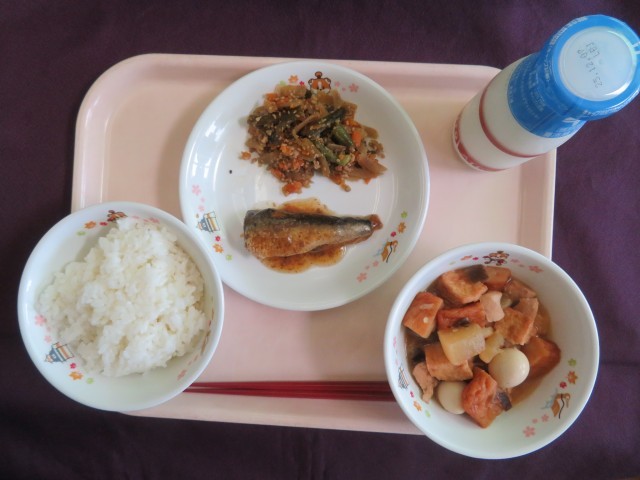 今日の給食は、ごはん 関東煮 いわしの梅煮 茎わかめとごぼうのきんぴら 牛乳 です。