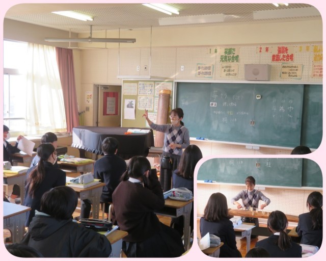 1年生の音楽は、現在、「筝」の学習を進めています。生徒たちはまず、筝という楽器を詳しく知ることからスタートしました。「爪」 など道具の役割や、糸を支える「柱(じ)」 の構造を学習。この柱の位置によって音がどのように鳴り、音階が作られる仕組みを、実際に音を聞きながら理解を深めました。今後、外部講師に来ていただき、より詳しく学習を進める予定です。