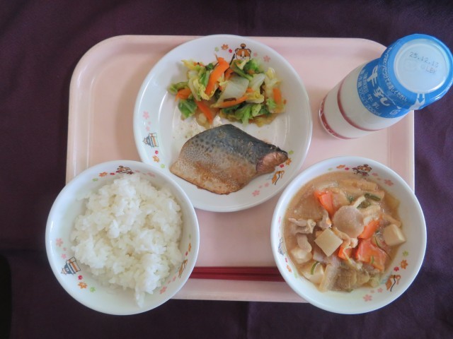 豆乳みそ汁は、旬のかぶや大根が入っています。豆乳や白いんげん豆のコクがでています。体が温まります。おいしく食べて体を温めて体調管理をしましょう。