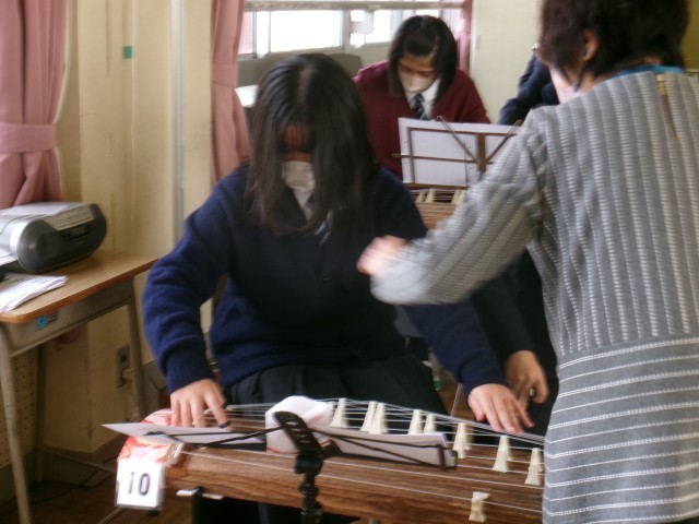 1年生の音楽の授業では、鶴見先生を講師としてお招きし、箏の演奏方法について丁寧にご指導いただきました。