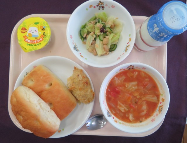 今日の給食は、「大阪・関西万博献立 ~イタリア料理~ 」フォカッチャ コトレッタ(ミラノ風手作りチキンカツレツ) インサラトーナ ミネストローネ パンナコッタ 牛乳 です。