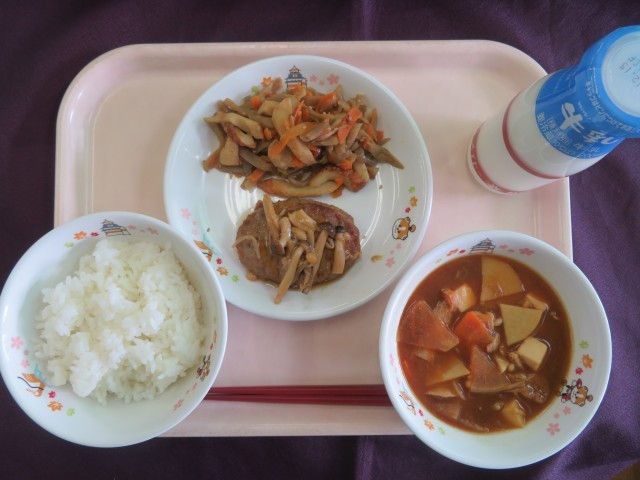 今日の給食は、ご飯 ハンバーグきのこソース 五目きんぴら 豚汁 牛乳 です。