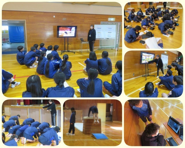 3年生保体では、器械運動(跳び箱)を行っています。まずは、前回実施時の自身の動画や手本となる動画を比較しながら、今日の練習で意識するポイントを各自で確認しました。しっかりとウォーミングアップを行った後、いよいよ跳び箱練習を行いました。切り返し系の技(開脚伸身跳び、屈伸跳びなど)の中から、各自が選んだ技に挑戦しています。練習の途中では、タブレットで撮影した自分の跳躍の瞬間を確認し、設定したポイント通りにできているか、その場で振り返りを行っています。授業のまとめでは、「振り返りカード」を活用し、跳んだ時の感覚や様子を文章で言語化し、仲間からの具体的なアドバイスも参考にしながら、次時への課題や上達方法をまとめました。