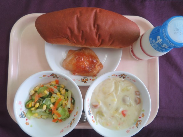 今日の給食は、クロロールパン 鶏肉のマーマレード焼き コールスローサラダ 犬山産白菜のクリームシチュー 牛乳 です。