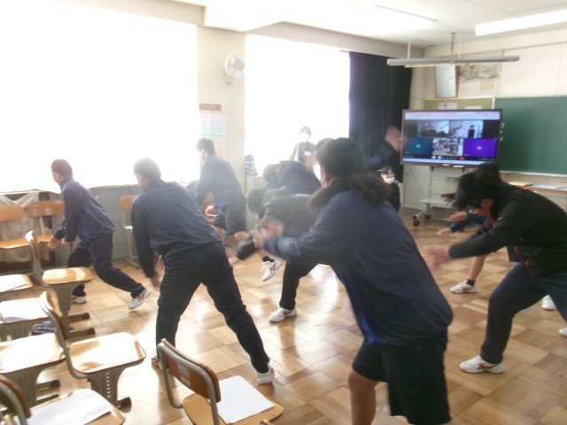 続いて、城中生からは中学校生活に関するクイズを出題しました。小学生のみなさんが積極的に手を挙げて答えてくださり、オンラインながらも一体感のある時間となりました。また、最後には城中生が練習を重ねてきた「城中ソーラン」を披露しました。