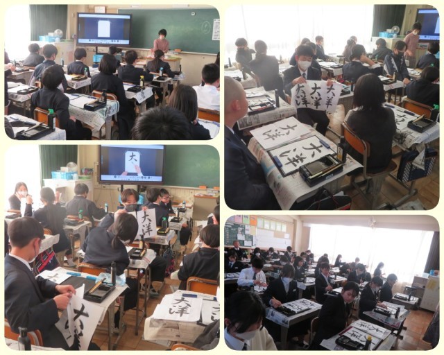 1年生の国語の授業で、書写(毛筆)を行いました。 今回は楷書での「とめ」や「はらい」はもちろん、筆の動きのつながりである筆脈を意識して練習しました。授業の途中に、お互いの作品を見せ合う時間を設けてアドバイスを交換しました。最後はアドバイスを参考に、再度集中して作品を仕上げました。