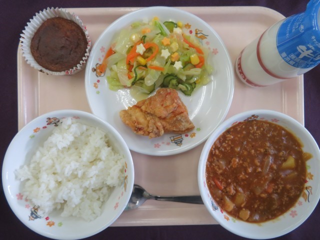 今日の給食は、「クリスマス献立」です。ご飯 フライドチキン 豚肉とひよこ豆のブラウンシチュー 星チーズのサラダ 犬山和紅茶とりんごの手作りケーキ 牛乳 です。