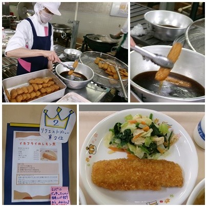 今日の給食は、「ご飯・いかフライのレモン煮・信田和え・鶏ごぼうみそ汁・牛乳」です。3年生の皆さんが学校給食を食べられる日も、残りわずかとなりました。そこで12月に「卒業前にもう一度食べたいメニュー」のアンケートを実施したところ、魅力的なリクエストがたくさん届きました。3月の卒業に向けて、それらの上位メニューを献立に取り入れて紹介していきます。