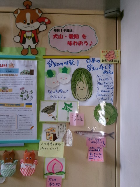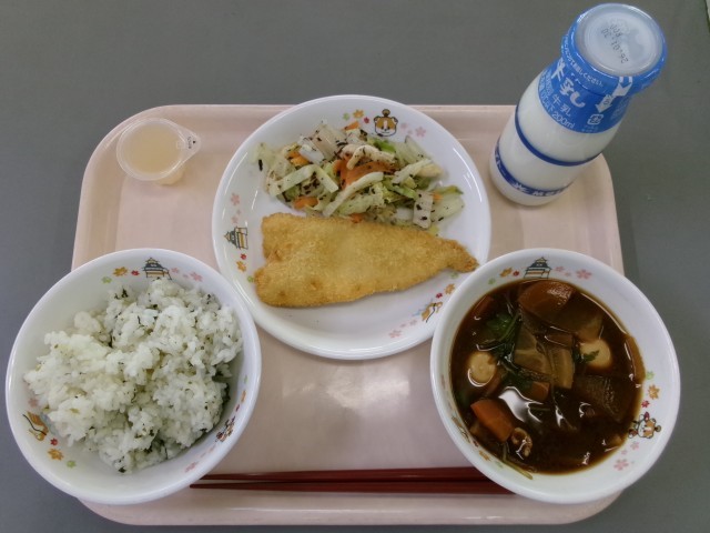 今日の給食は、『犬山・愛知を味わおう♪』です。あいちの大根葉ごはん にぎすフライ 白菜の愛知赤じそ和え 愛知の味覚汁 犬山桃ゼリー 牛乳 です。