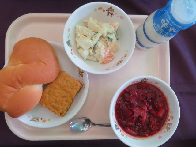 今日の給食は、『大阪・関西万博記念献立~ウクライナ料理~』クロスロールパン、ボルシチ、オリビエ・サラダ(ウクライナのポテトサラダ) 、モルコビニチェ(ウクライナのキャロットケーキ) 、牛乳 です。