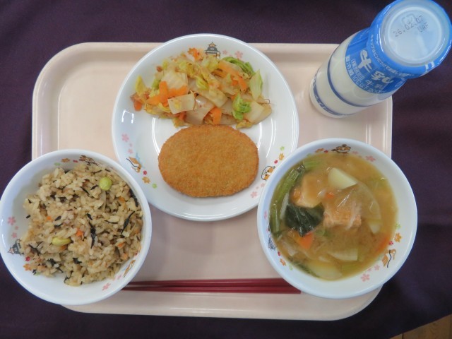 五色ごはん(自校炊飯)、昔ながらのコロッケ、白菜のおかか和え、栄養みそ汁、牛乳