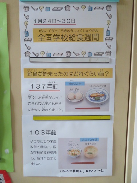 1月の給食目標は『学校給食について知ろう』です。1月24日から30日は「全国学校給食週間」。給食の歴史を振り返る献立が登場します。 2日目の今日は、今から約100年前の1923年(大正12年頃)にタイムスリップしてみましょう。