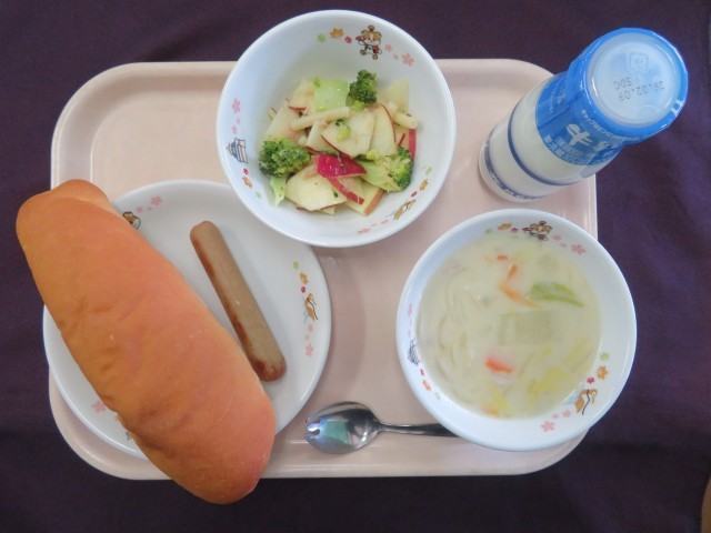 今日の給食は、「昭和以降の献立(パン給食登場!)」ロールパン 里いもとかぶのクリームシチュー 焼きフランクフルト りんごとブロッコリーのサラダ 牛乳 です。