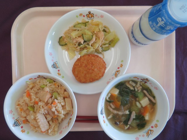 今日の給食は、中華風体込みご飯(自校炊飯) 里いもコロッケ 切り干し大根とささみの中華和え チンゲン菜と春雨のスープ 牛乳 です。中華風炊き込みご飯は、給食室で鶏肉やたけのこ、枝豆などの具材を炒めてα化米を使って炊き込みました。もち米も入っているのでおこわ風のもちもち食感です。お米の中までうま味がぎゅっと入っています。給食室の大きな釜で、和・洋・中さまざまな味つけのご飯も炊いてとりいれています。給食室が学校にある犬山ならではの献立です。炊きたてを味わってください。