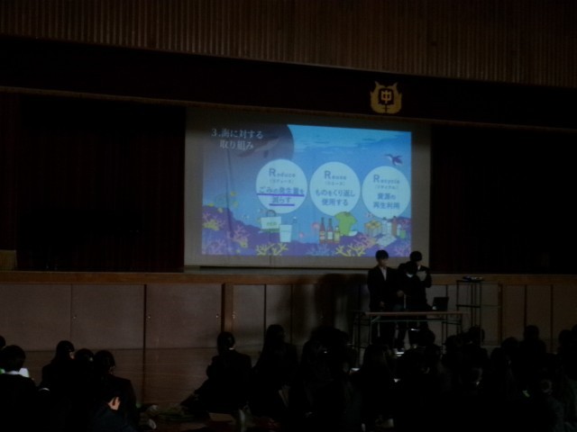 体育館で、各分野の代表者による「総合的な学習の時間」のまとめの発表が行われました。