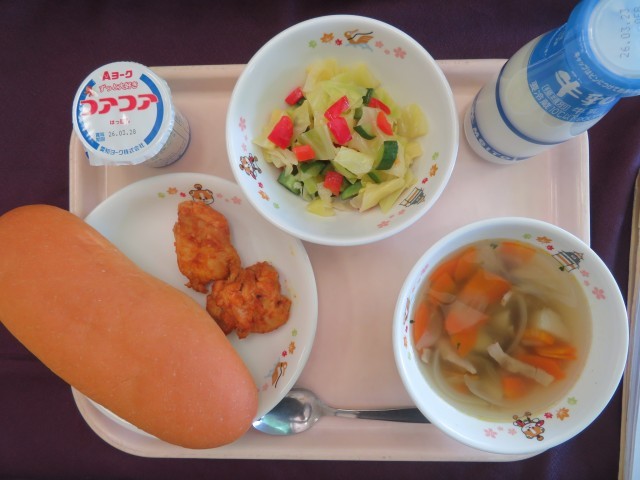 今日の給食は、「大阪・関西万博記念献立 ~トルコ料理~」ロールパン ケバブ風チキン チョバン・サラタス メジルメッキ・チョルバス(レンズ豆のスープ) ヨーグルト 牛乳 です。