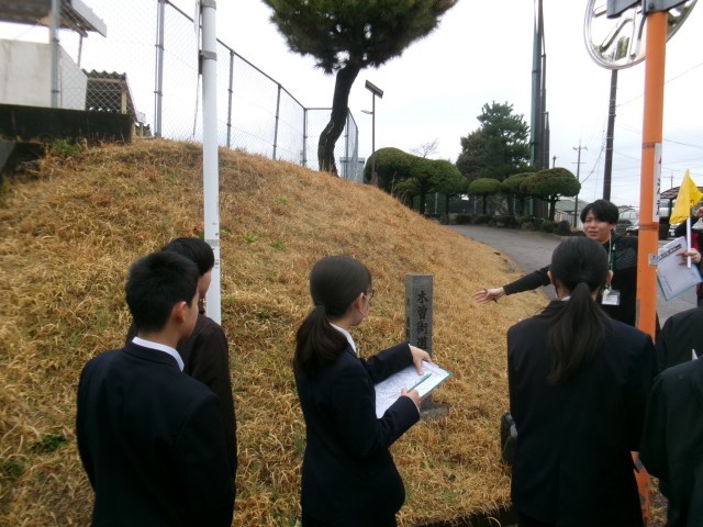 生徒たちは熊野神社までの道のりを実際に歩きながら、土地の高低差や地形の特徴、周囲の建物の様子など、地図だけでは気付きにくい点を自分の目で確かめました。