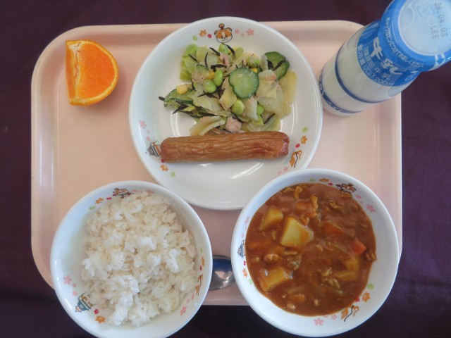 今日の給食は、麦ごはん カレー 焼きフランクフルト 枝豆サラダ デコポン 牛乳 です。