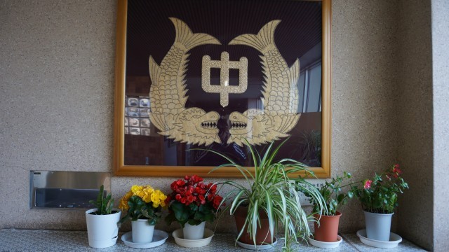 写真は、正面玄関に掲示している校章です。歴史ある本校の校章が来校される方を静かに見守っています。以前は体育館で長く生徒たちを見守ってきたこの校章は、現在、学校の「顔」である玄関に移されました。新年度の始まりに合わせ、校舎に輝きを添えてくれています。
