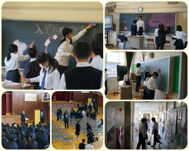 明日(9日)の入学式に向けて、2・3年生が会場や教室の準備を行いました。生徒たちは、自分たちが入学したときに温かく迎えられたことを思い出しながら、体育館の会場設営や、1年生の教室・廊下の清掃、飾り付けを進めてくれました。