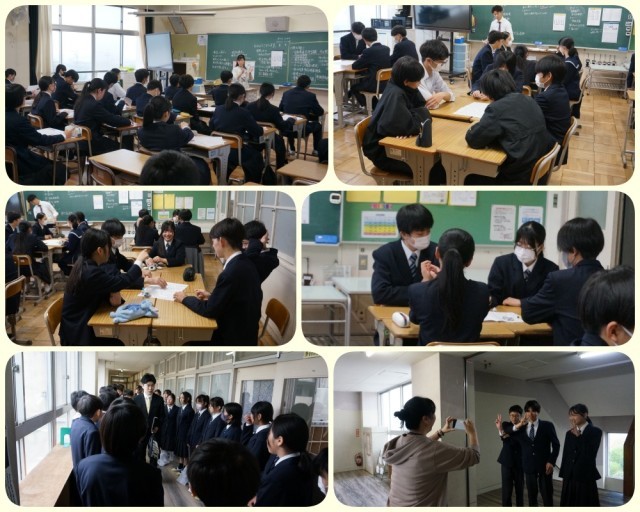 写真は、学級活動の様子です。グループごとに交流を深めたり、掲示用の写真を撮影したりしながら、新しい仲間との和やかな時間が流れていました。また1年生は、校内を巡りながら生活環境の確認も行っています。こうした一つ一つの活動を通し、生徒たちは新しい環境への準備を着実に整えています。
