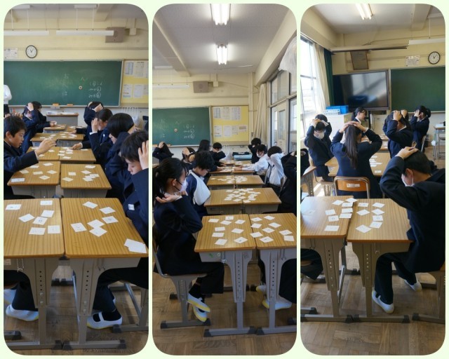 1年生の英語の授業では、オリエンテーションとして英語カードを使ったゲームを取り入れました。先生が英単語を読み上げるのを真剣な表情で待ち構える生徒たち。「これだ!」と分かった瞬間に、頭に置いていた手を素早くカードへと伸ばしていました。教室には賑やかな歓声が響き、楽しみながら英語に親しむスタートとなったようです。