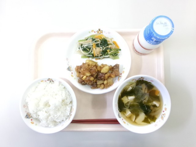 今日の献立は、ご飯 まぐろと大豆のごまがらめ 野菜のなめ茸和え わかめ汁 牛乳 です。