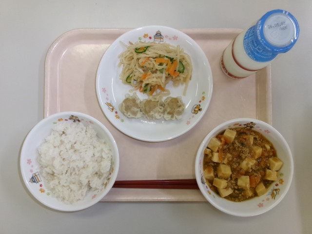 今日の献立は、麦ご飯 マーボー豆腐 しゅうまい もやしの中華和え 牛乳 です。