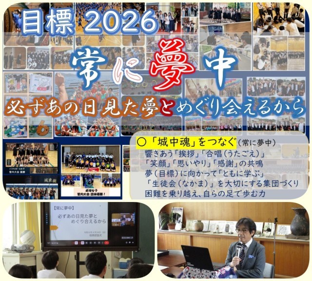 本日、前期の学級代表、書記、議員、そして各委員会の委員長に認証状を授与しました。リーダーに選ばれた皆さんはもちろん、今、教室でこの放送を聞いている生徒全員が、互いに手を取り合い、この城東中学校をさらに高めてくれることを心から期待しています。認証式の後、校長先生から本年度の目標について話がありました。掲げた言葉は、昨年度から引き続き「常に夢中」。そして今年はさらに、一つのフレーズが加わりました。