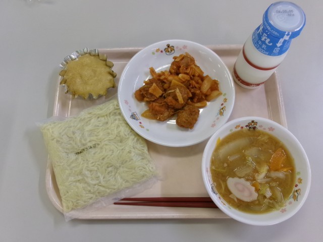 今日の献立は、味噌ラーメン 肉団子のチリ野菜ソース 手作りチーズ蒸しパン 牛乳 です。