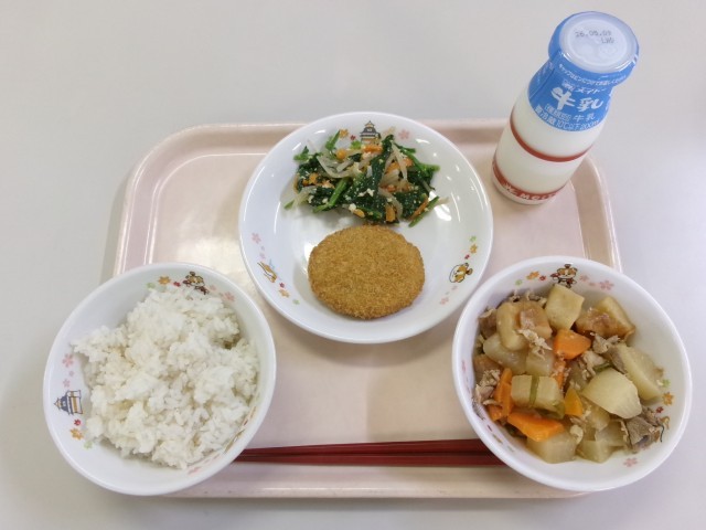 今日の献立は、麦ご飯 菜の花コロッケ ほうれん草の白和え風 豚肉と大根の煮物 牛乳 です。