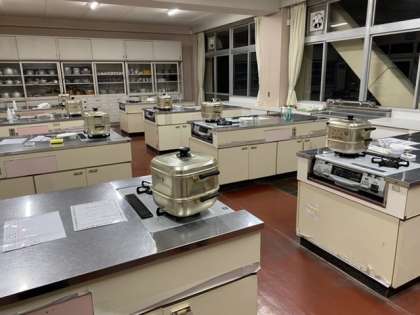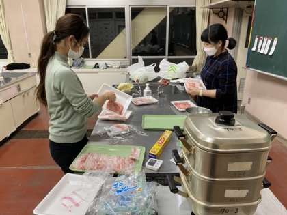 2年生の調理実習の準備をしています。新型コロナウイルス感染防止のため、普段なら生徒が切っている野菜や、取り分けているお肉を職員が切ったり分けたりして、安全に調理実習が行われるように準備しています。