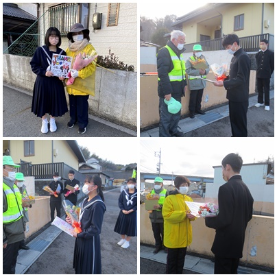 3年間、雨の日も風の日も登下校を見守ってくださった交通指導員の方々に、今朝3年生が感謝の思いを伝えました。いつも交通安全に気を配っていただき本当にありがとうございました。